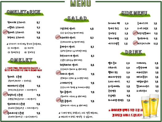 세트 메뉴도 있고, 저는 이중에서 주로 "칠리미트 오믈렛"을 가장 좋아한답니다. 샐러드 종류도 양이 많고 맛있는 편이에요. 가격은 단품 기준 최대 1만 원 정도 하네요.