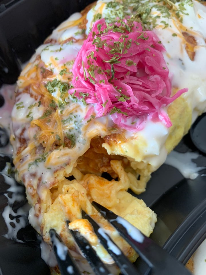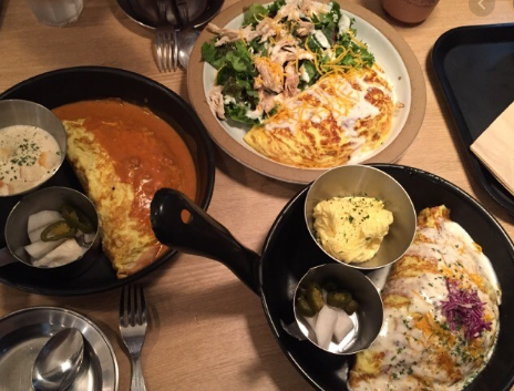 오믈렛에 치즈, 채소, 고기 등 여러 재료가 들어가있습니다. 소스와 잘 요리한 오믈렛이 입맛을 돋워준답니다.