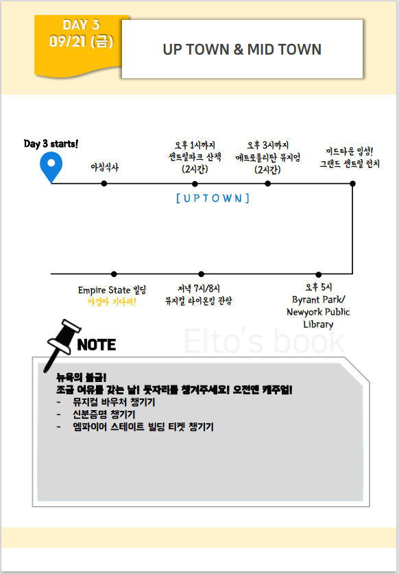 뉴욕 여행 계획 / 뉴욕여행 셀프가이드북 3일 차 표지와 동선입니다.