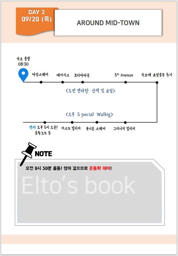 이번에는 뉴욕 여행 계획 / 뉴욕여행 셀프가이드북 2일 차 표지와 동선입니다.