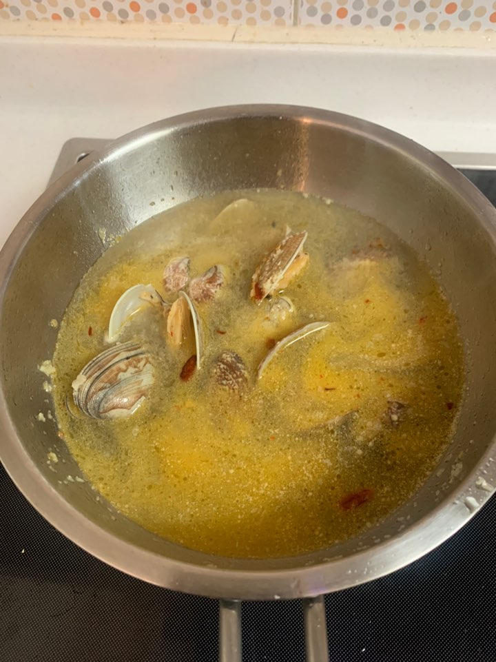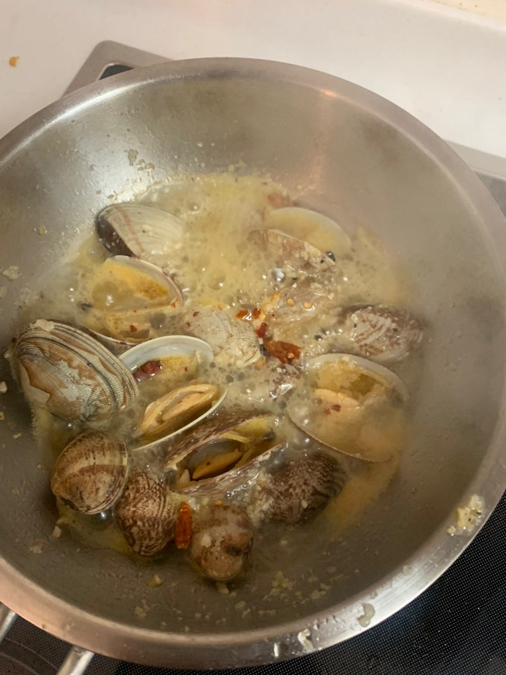 바지락 입이 열리면서 점차 뽀얀 색을 내며 육수가 나옵니다! 마늘향 올리브 오일과 섞여 이태리스러운 풍미가 시작돼요! 저는 이 부분에서 페퍼 론 치로와 집에 있는 파프리카 가루를 넣어줬습니다. 조금 칼칼하고 매운맛을 원해서 페퍼론치노를 으깨면서 넣어줬어요. 알싸한 매운맛을 원하지 않으실 경우 통으로 넣거나, 아예 빼셔도 돼요!