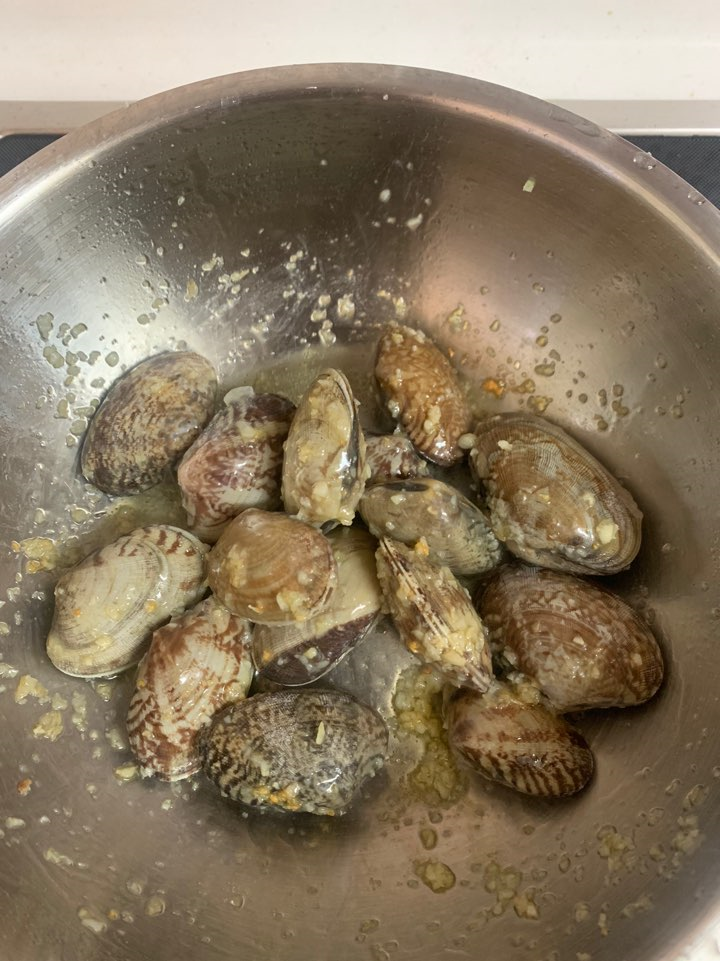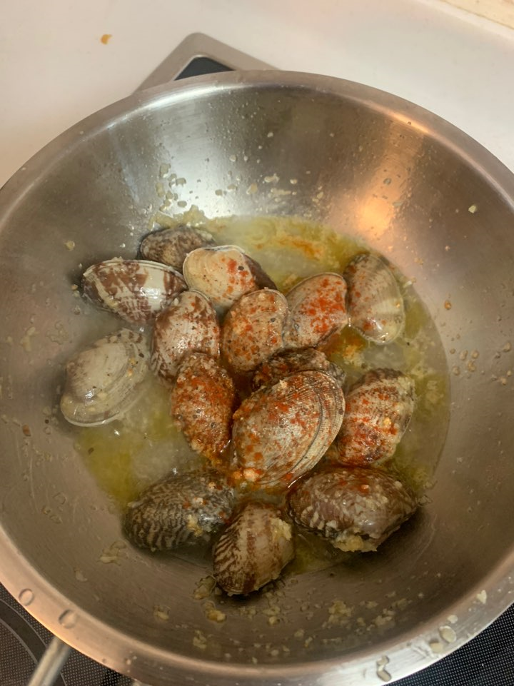 바지락 자체가 짠맛이 나기 때문에, 감바스처럼 밑간은 강하게 안 해주셔도 되는데요! 풍미를 위해서 적당량의 후추나 소금을 투하하셔도 됩니다.