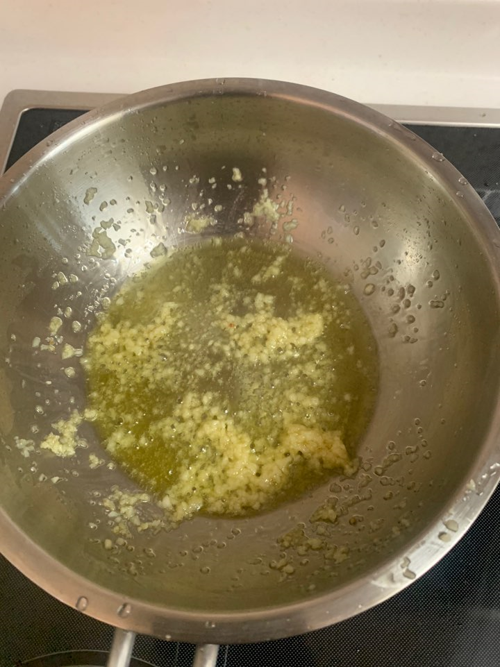 STEP 1. 올리브 오일과 다진 마늘을 함께 볶아줍니다. (이때 페퍼론치노도 함께 볶아주세요!)