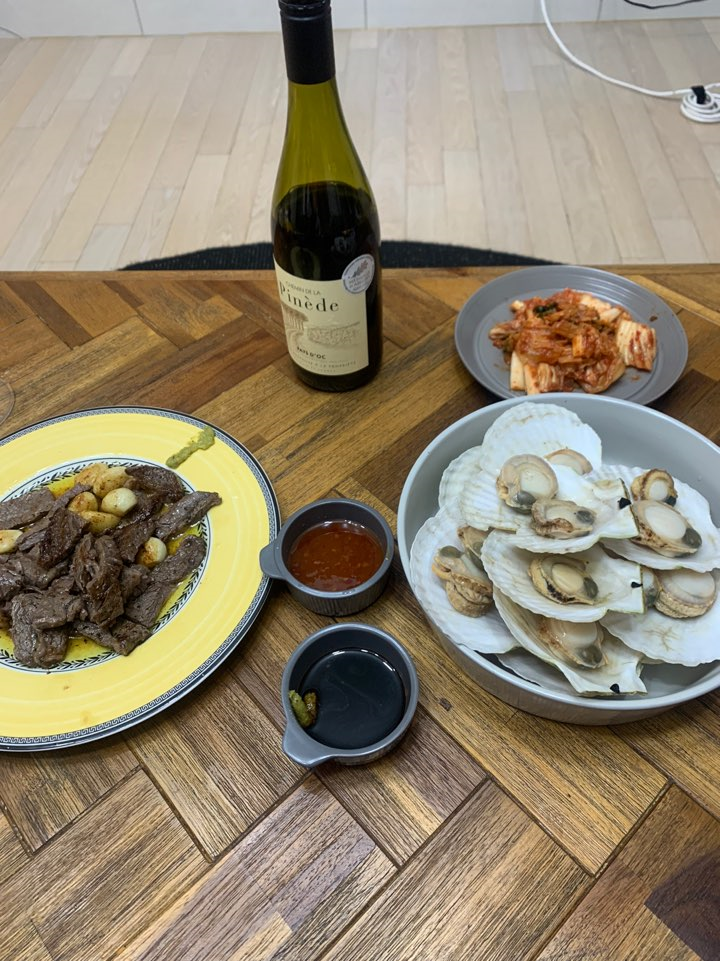 가리비찜은 저렇게 두 판 정도 나왔어요. 아쉬운 마음에 소고기도 같이 준비했습니다 :)