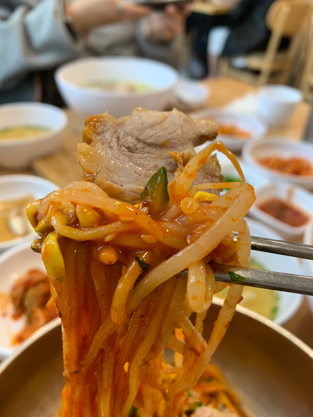 고기 국수와 비빔 국수의 면을 같은 면같고, 옥수수 면처럼 색이 노란빛을 띠네요. 탄력이 있고 중면이라 호불호 없이 좋았어요. 그리고 고기국수 육수를 먹는 순간, 강렬한 나트륨과 칼칼함이 바로 흡수됩니다. 그냥 무조건 맛있어요.