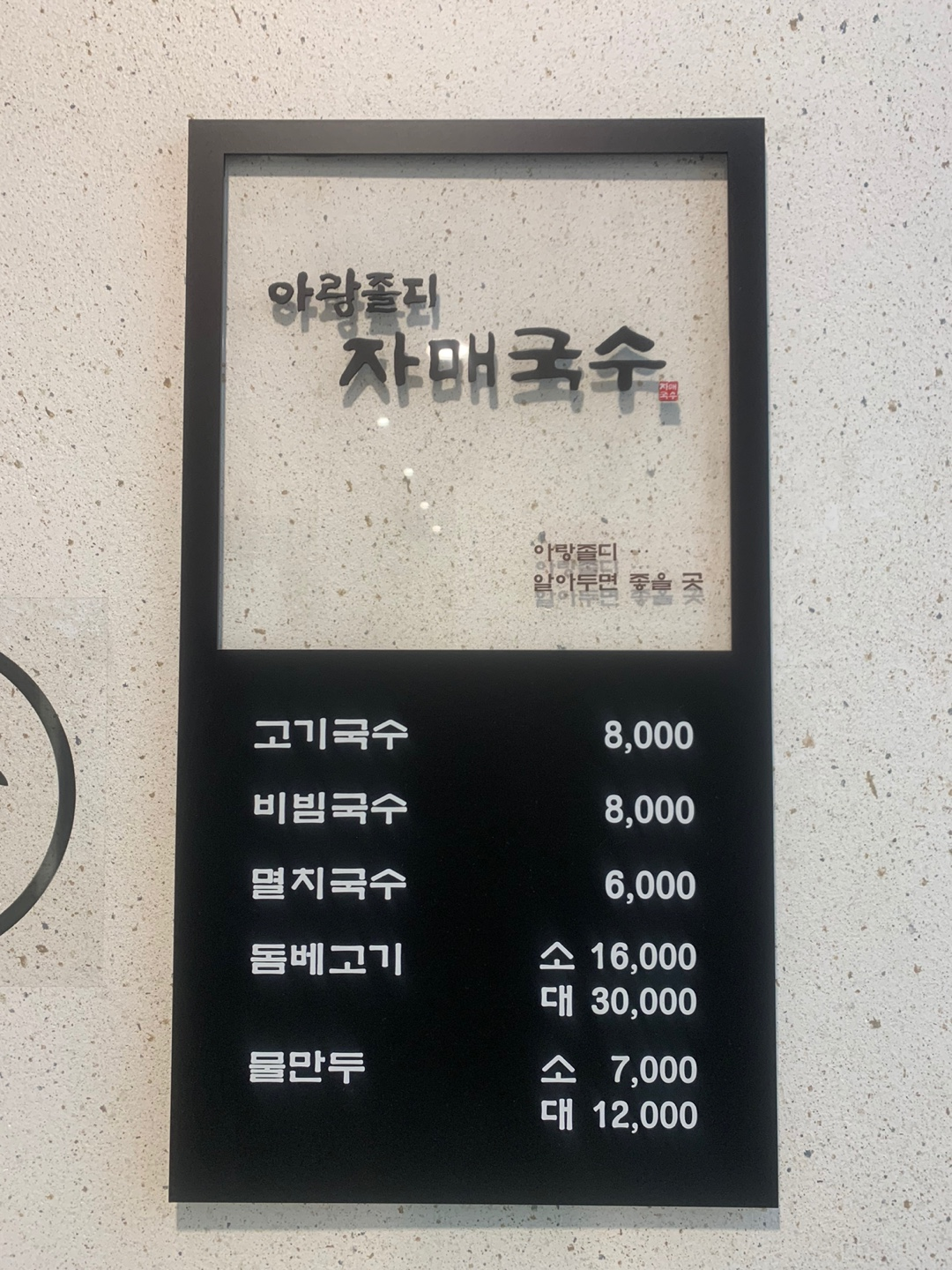 대기하며 찍은 자매국수 대표 메뉴 및 가격표입니다. 관광객을 타깃으로 한 식당의 가격치곤 꽤 괜찮죠. 저희 앞에 네 팀 정도 대기하고 있었는데, 순환도 빠르고 대기하는 것이 불편하지 않았어요. 저희는 네 명이서 고기국수 2, 비빔국수 2, 돔베고기 소 1개를 주문했습니다.