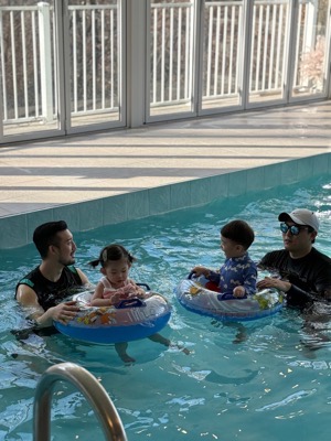 물 온도가 적절하게 유지되어서 오래 놀아도 춥지 않았어요! 영유아가 즐길 수 있는 미끄럼틀과 보행기 튜브는 덤!